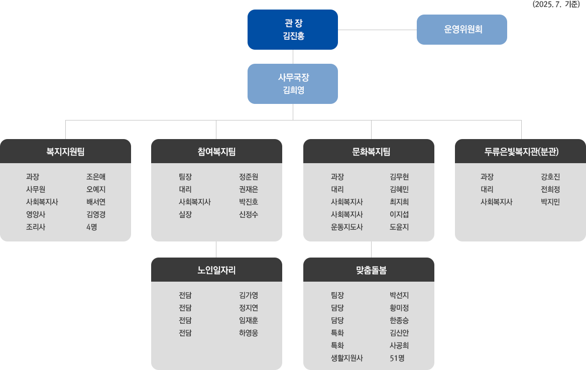 | 총원 | 관장 | 부장(사무국장) | 팀장 | 담당 |